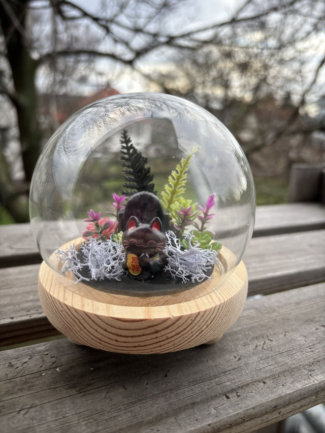 Stylová dekorace ve formě skleněné kupole na dřevěném podstavci. Uvnitř se nachází pečlivě aranžovaná mini zahrádka se zeleným „trávníkem“, drobnými sukulenty a malými barevnými kvítky, které dodávají celé kompozici svěží a hravý vzhled. Dominantním prvkem je hezká a roztomilá figurka, která dotváří osobitý charakter dekorace.