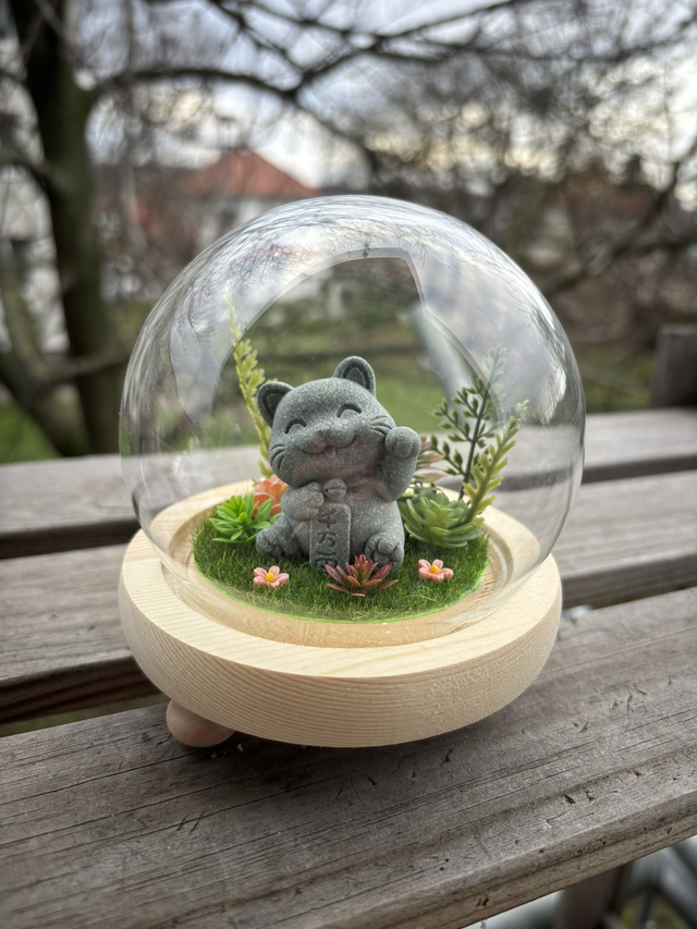 Stylová dekorace ve formě skleněné kupole na dřevěném podstavci. Uvnitř se nachází pečlivě aranžovaná mini zahrádka se zeleným „trávníkem“, drobnými sukulenty a malými barevnými kvítky, které dodávají celé kompozici svěží a hravý vzhled. Dominantním prvkem je hezká a roztomilá figurka, která dotváří osobitý charakter dekorace.
