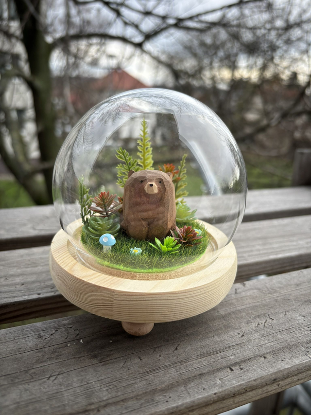 Stylová dekorace ve formě skleněné kupole na dřevěném podstavci. Uvnitř se nachází pečlivě aranžovaná mini zahrádka se zeleným „trávníkem“, drobnými sukulenty a malými barevnými kvítky, které dodávají celé kompozici svěží a hravý vzhled. Dominantním prvkem je hezká a roztomilá figurka, která dotváří osobitý charakter dekorace.