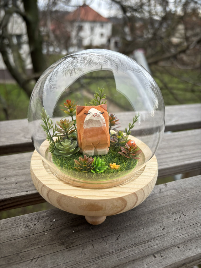 Stylová dekorace ve formě skleněné kupole na dřevěném podstavci. Uvnitř se nachází pečlivě aranžovaná mini zahrádka se zeleným „trávníkem“, drobnými sukulenty a malými barevnými kvítky, které dodávají celé kompozici svěží a hravý vzhled. Dominantním prvkem je hezká a roztomilá figurka, která dotváří osobitý charakter dekorace.